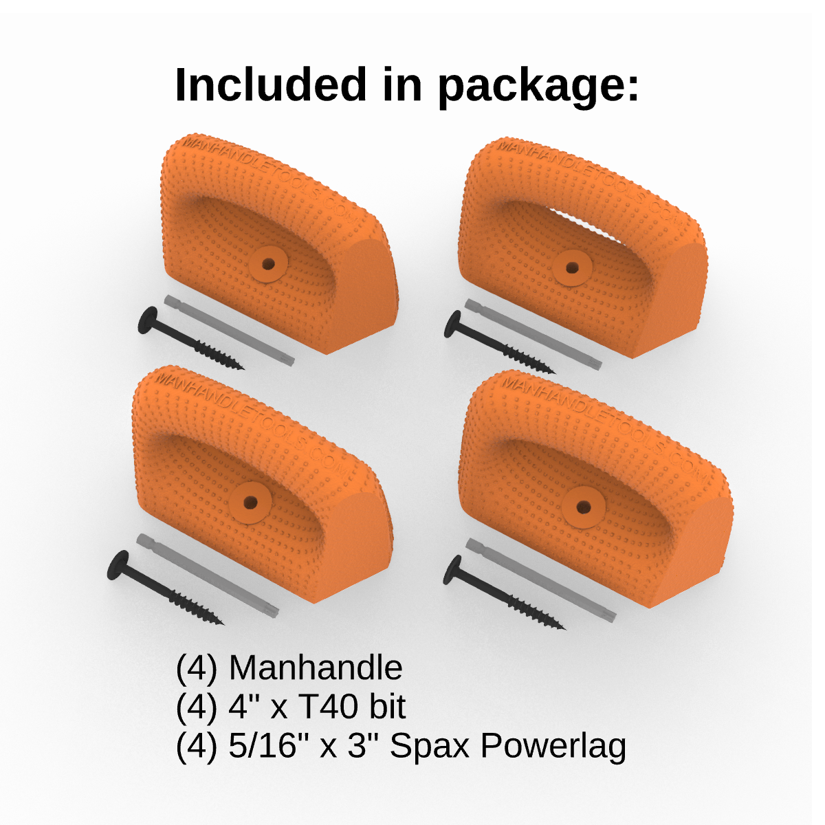Every Manhandle comes standard with a bit and screw: 4" T40 star-drive bit and 5/16" x 3" Spax Powerlag structural wood screw. No pre-drilling required. All you need to install the handle is a 1/4" electric drill or driver.